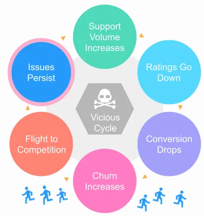 So what happens when you are flying blind without this warning system? You could enter a vicious cycle, where bugs go undetected and linger for far too long, causing customer dissatisfaction, leading to churn and the abandonment of your product for a competitor’s. Lingering quality issues can cascade throughout your organization, with more support tickets being submitted, more 1-star reviews being written, higher user churn, and lower engagement.