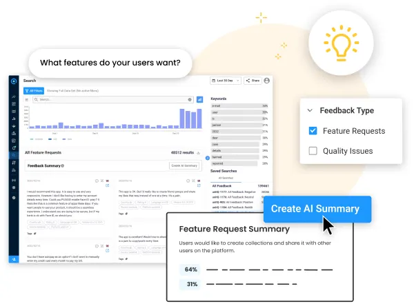 Having processed hundreds of millions of pieces of user feedback, unitQ’s machine learning can accurately differentiate between feature requests, bugs, user experience issues, and more — and categorize the feedback at a very granular level. That means your team can spend less time manually aggregating feedback and more time taking action.